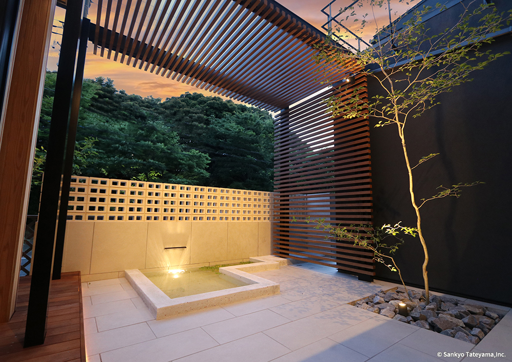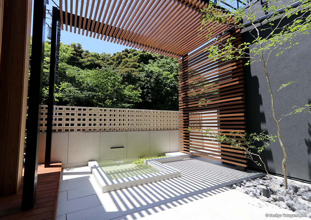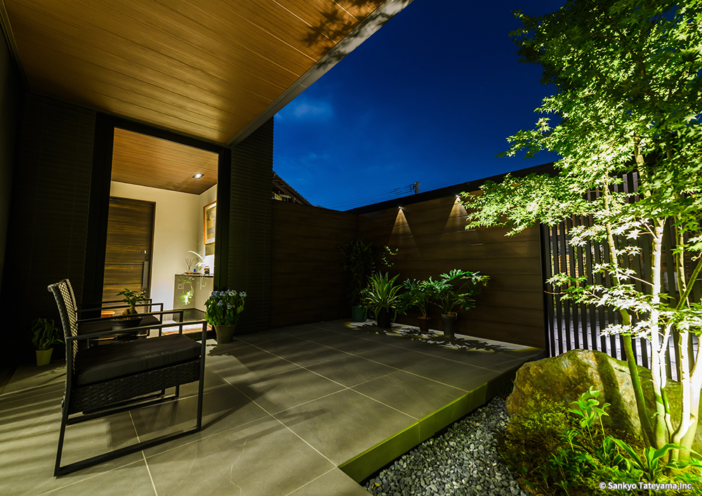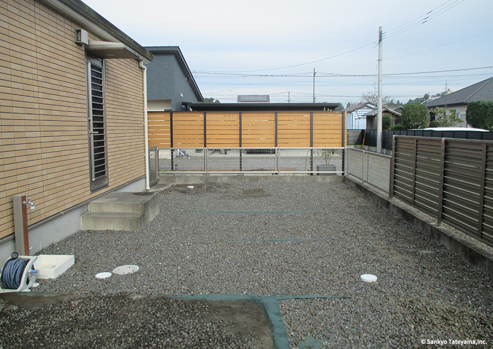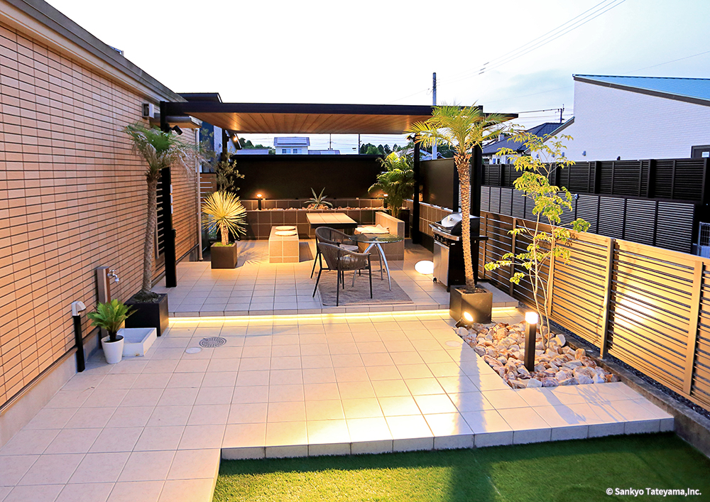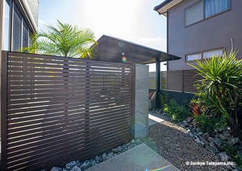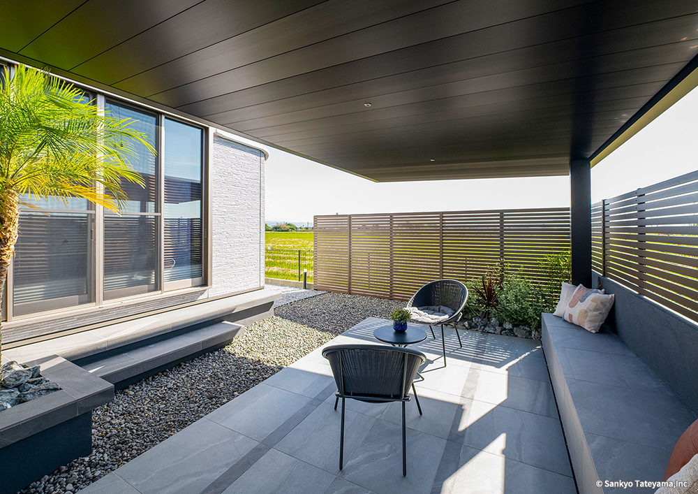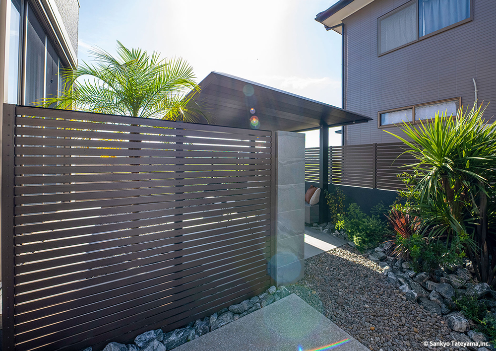 リビングから直結する専用庭空間に利用価値を高めるべく出る楽しみの提案とされるアウトドアリングを構成した作品。プライバシー向上を目的に目隠しをしたとて結果時にその場の滞在時間は限られていくるもの。だからこそとプライベートスペースの有意義な実用提案を行い実用化することがオーナー様にとって大切なことであろう。外周フェンスとあわせ屋根を設置し日差しや目隠しを抑止できれば出やすい環境作りが必須で造作ベンチやタイル貼りのテラスがあれば気分転換を叶える楽しみが如何様にも増幅され満足度の高い庭空間となったことだろう。