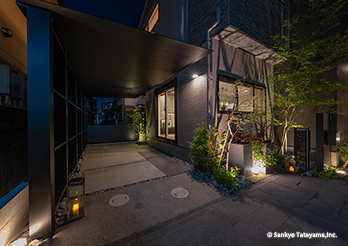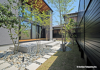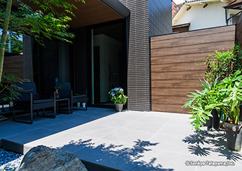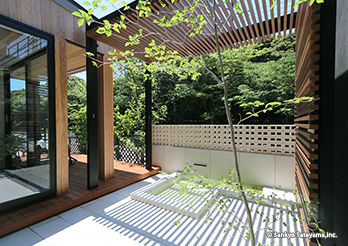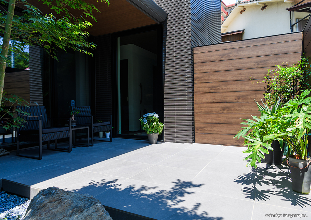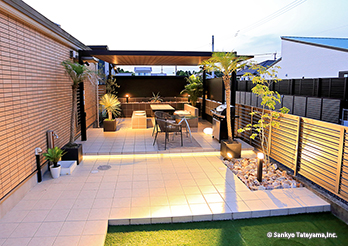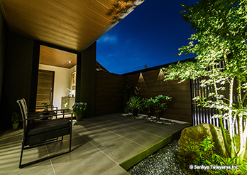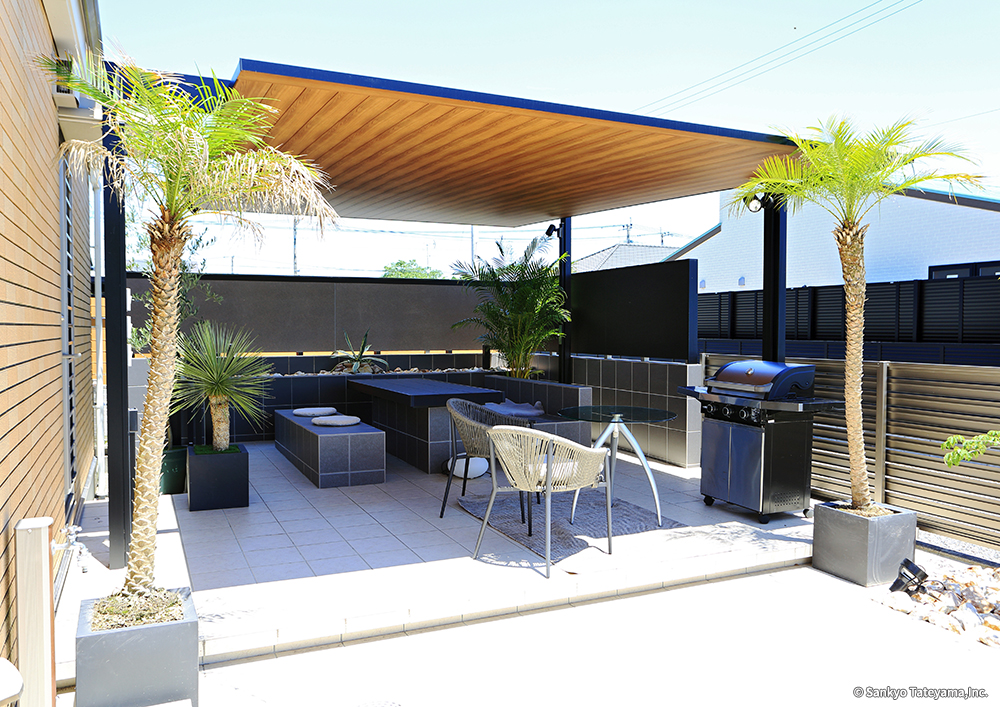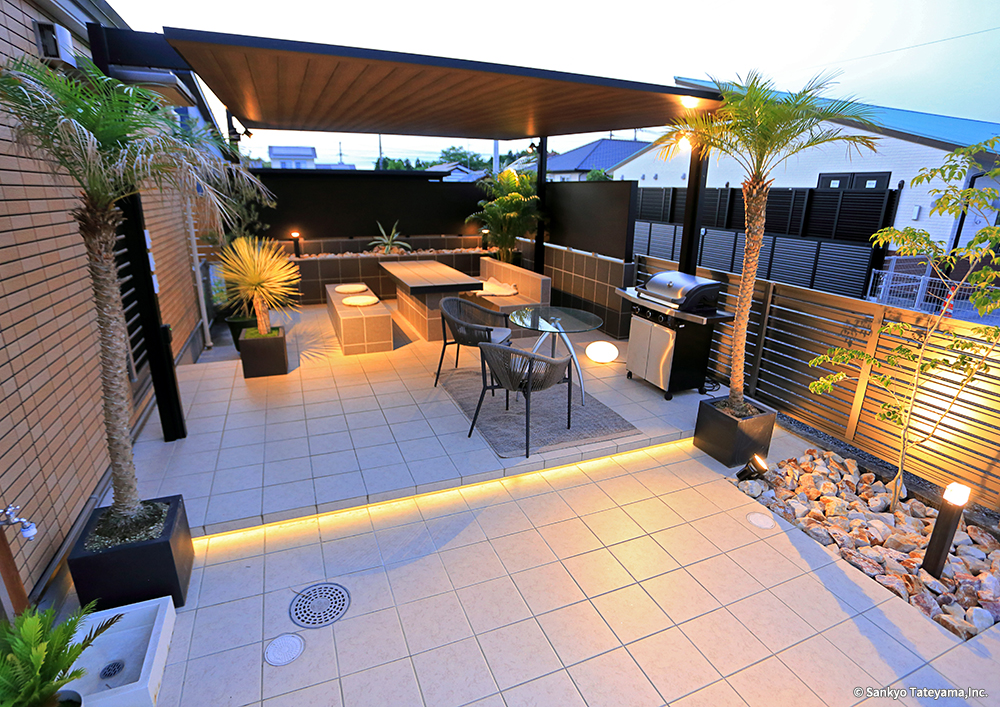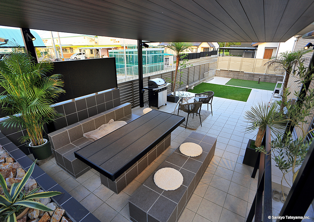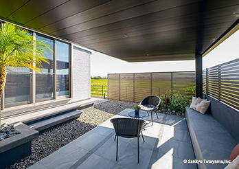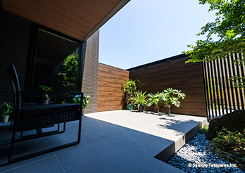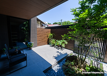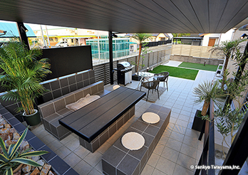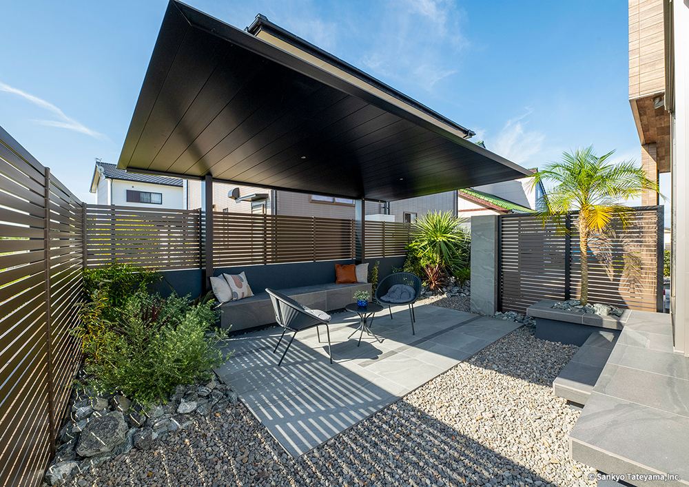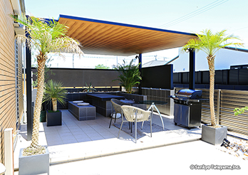 敷地内の余白空間を最大限に活かすべく自身が手掛けた外構から引き続き庭提案を実現させ具体化したという作品。大きく変化するライフスタイルではその時々に求められる内容は違ってくるもの。当初は簡易舗装程度で良くても住み心地を向上させるにはやはり出やすい庭環境が理想になる。特に現在ではアウトドアリビングとした造形主体の庭計画が主流で敷地内有効利用と考えれば設備の整ったテラスは最適であったはず。屋根の設営により天候に左右されず滞在が可能になり手軽に楽しめる設備を整えたことにより満足度の高さが窺い知れる空間であった。