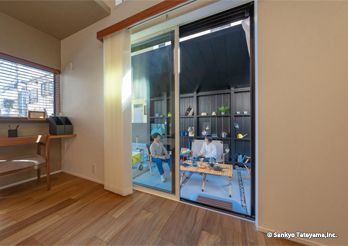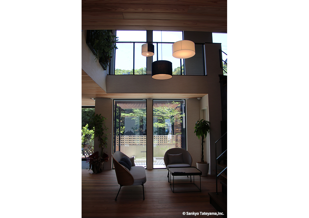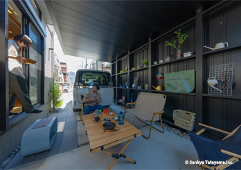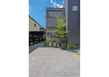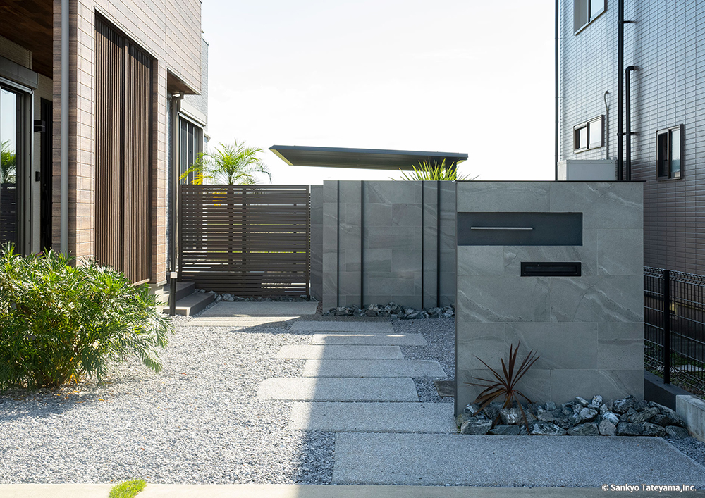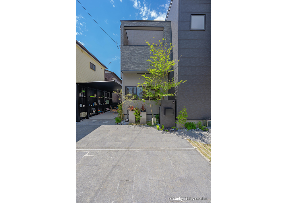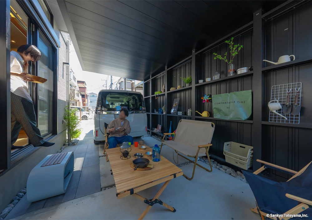 年の風を感じのびやかな暮らしを叶える分譲地において限られた敷地の中で実用性と機能性を兼ね揃えた車庫空間を提案しようと商品メリットを最大限に活かし描かれた作品。カーポートの設置で単なる屋根という目的以外に目隠しや雨水抑止としてパネルやフェンスで仕切る程度が一般的だが「FⅡ」の構造を活かして車庫空間を魅力的な屋外部屋として実現させた。サイドパネルを背景に柱間を造作棚化しおしゃれな車庫空間へと生まれ変えるテクニックは注目すべき点。インテリア連動や空間利用方法を兼ねる車庫が分譲地に備えられていたとすれば嬉しいだろう。
