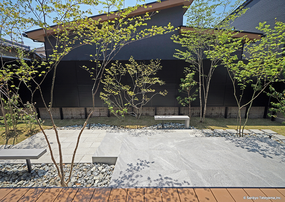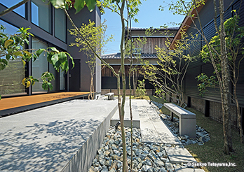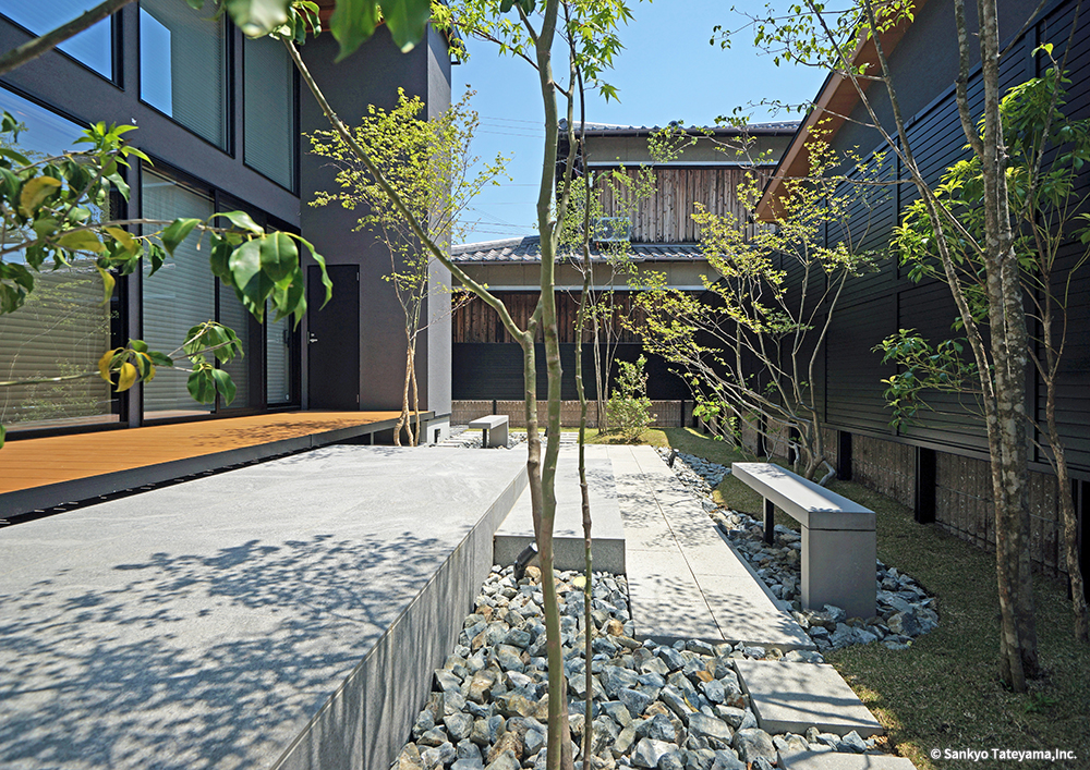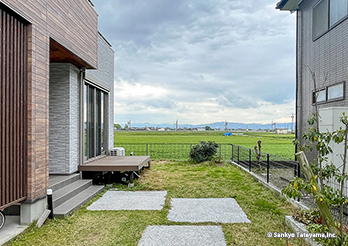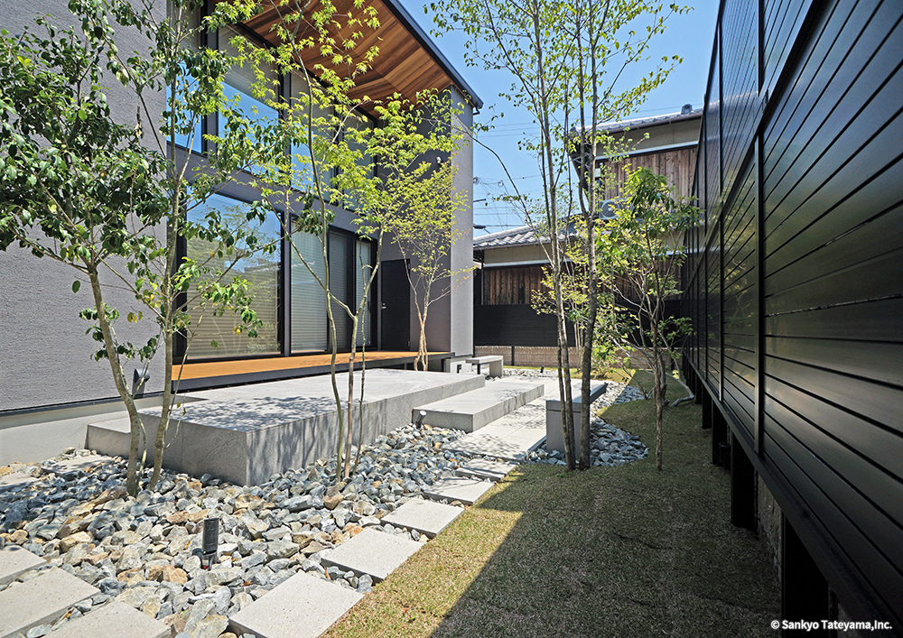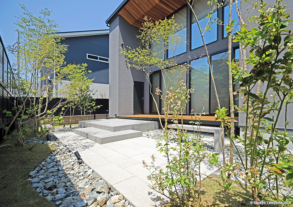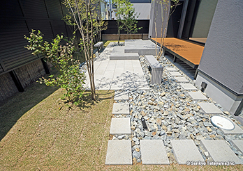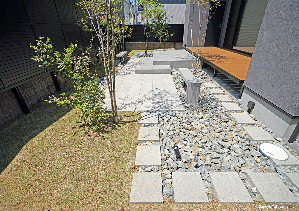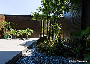 建築側に望む全面窓から眺め見る庭空間にシンプルでありながら和モダンテイストの植栽計画で柔らかな雑木の木立で飾り魅せる庭づくりの提案作品。外周部の目隠しフェンスで空間を囲みプライバシーを向上させた上で部屋と繋がる人工木デッキで出やすい環境を作りだす。そのうえで庭へのアクセスとしてタイルやコンクリート平板を駆使しながら過ごす空間と眺め見る空間による二刀流を実現させた。自然豊かな演出として雑木主体の緑化計画により季節の移り変わりや時間経過による影の動きなどを楽し見える程よいサイズの樹木が飾り付けられていた。