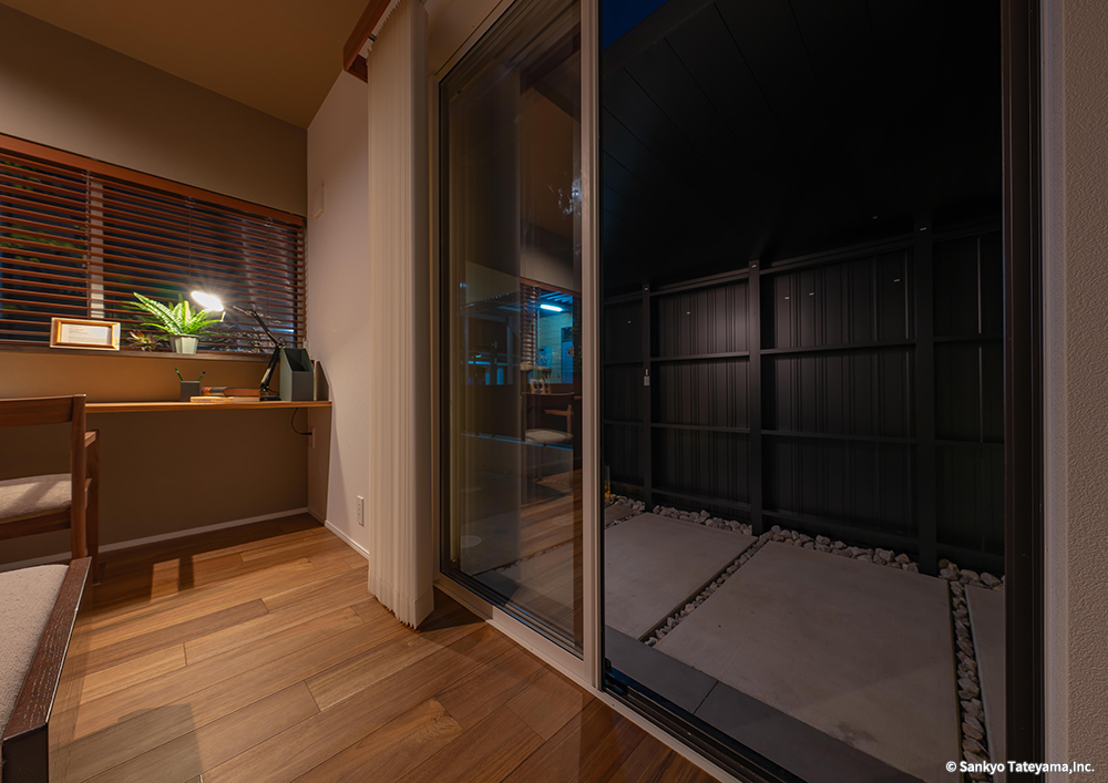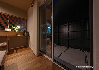 プライバシー効果を高め利用価値を向上させるべく部屋と繋がる中庭計画を出やすい環境提案として描かれた作品である。立地条件から単なるテラスであり覗かれる心配があった場所を高さのある乾式工法の壁面により独立した屋外空間を切り取り安心して過ごせる場所を確立させた。出やすく滞在を目的とすべくフロアやファニチャーを整備しながら景観を意識した程よい規模の緑化計画も取り入れ限られた空間でも楽しめるようなハコ庭的空間をうまく表現し構成していた。照明演出もしっかり提案されており時間を問わず屋外空間を楽しんでいることだろう。
