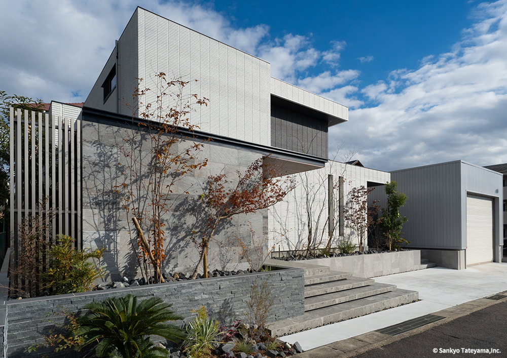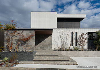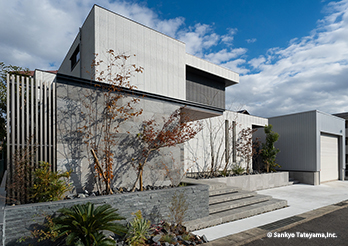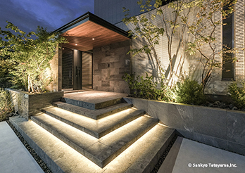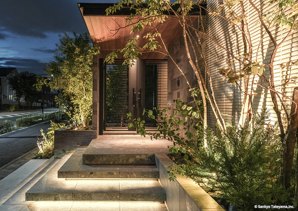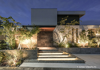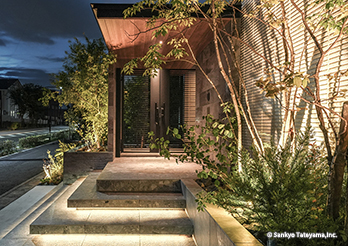 限られた空間の中で乾式工法セミフレキシブル化商品「X.スタイル」の特徴やメリットを最大有効活用しあたかも建築の延長庇のように魅せる巧妙でうまいテクニックが折り重なったハード面”強”と周辺環境を意識したソフト面の緑化計画”弱”の融合でスタイリッシュにまとめた素晴らしい作品が高評価を得た。集合住宅でも通用するような門構えを個人邸に取り入れ通り行く人に印象つける特別な構えを考案したという。高低差を楽しむリズムある浮遊ステップの演出効果を加えクランク形状のファサードデザインが重厚な印象を映し高級感を彷彿させる。照明計画は景観環境を意識した緑化計画を浮きあげまちのシンボル的演出効果として価値を含め設計者の拘りが伝わってきた。