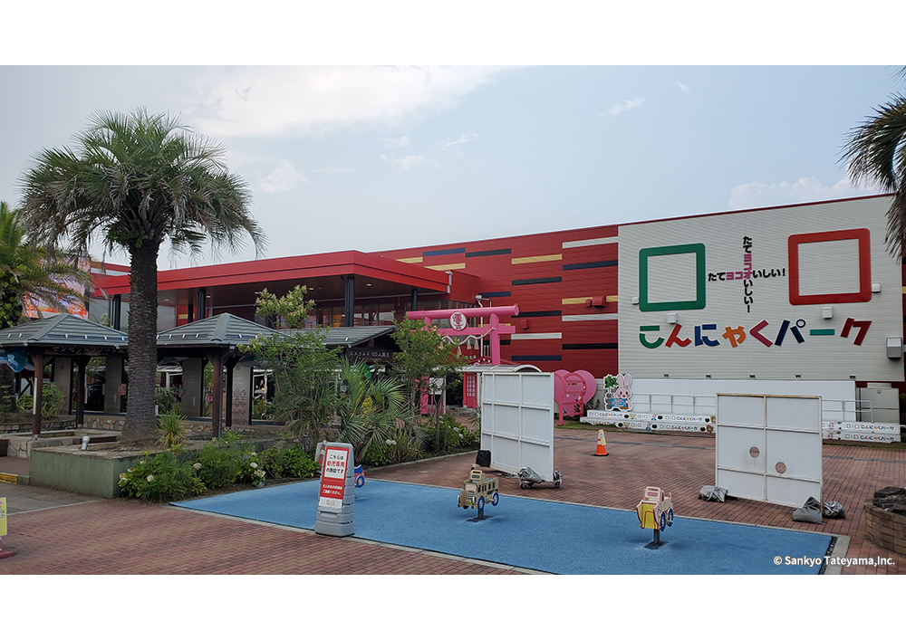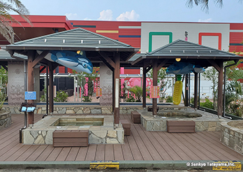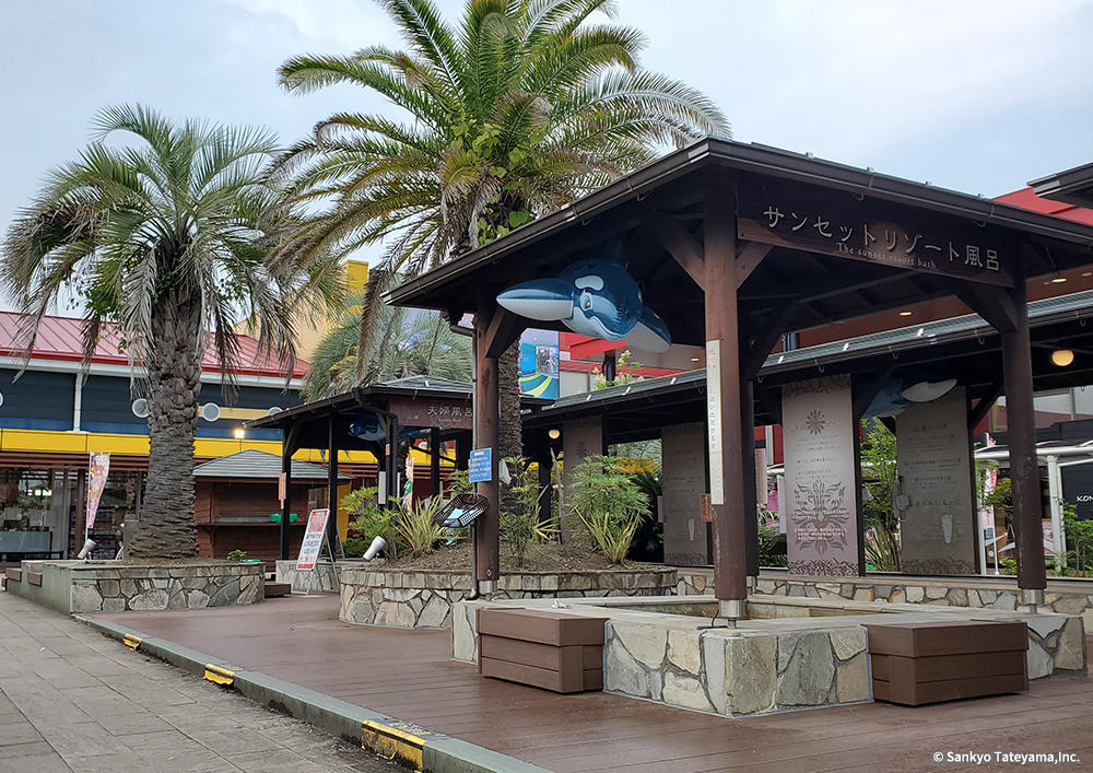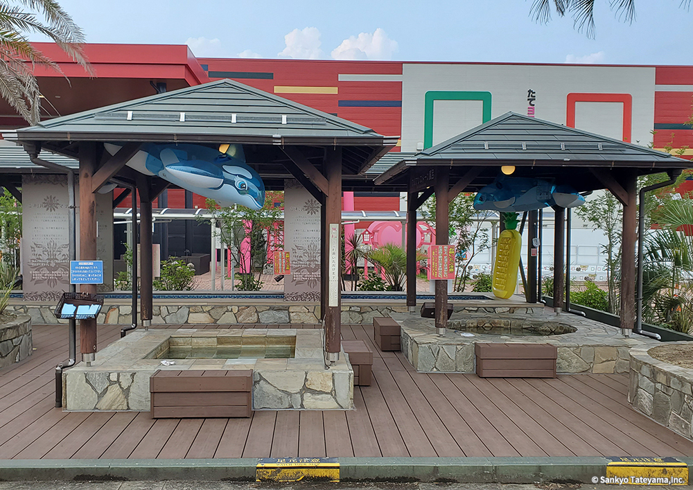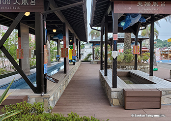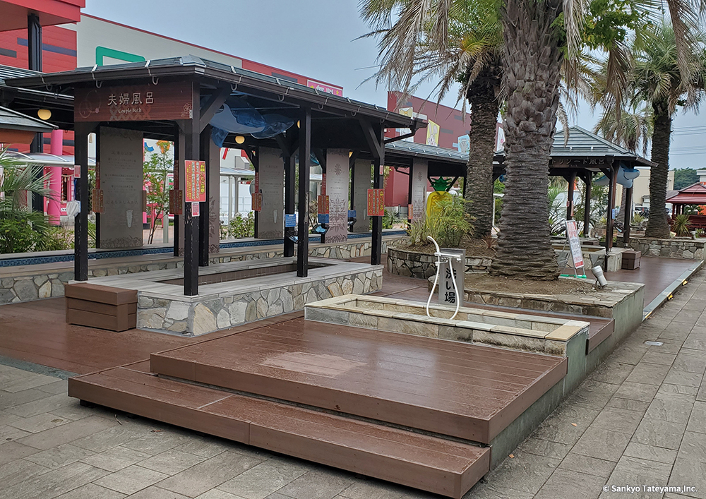 テーマパークは、明確なテーマのもと最大限に来客者をもてなす空間である。「こんにゃくパーク」と名付けられたこのパークの中で、遊び疲れた人々を癒しの空間に導くエリアに、ヴィラウッドが使われている。「サンセットリゾート風呂」「夫婦風呂」などと名付けられたそれぞれの足湯コーナーは、あっちもこっちもと移り楽しむ人々の様子が目に浮かぶ。その移動の土台を支えているのがこの製品である。どんな使い方にも耐えうる素材を、全体のイメージをつなぐ役割として、うまく活用された事例である。
