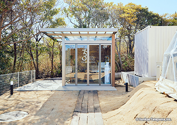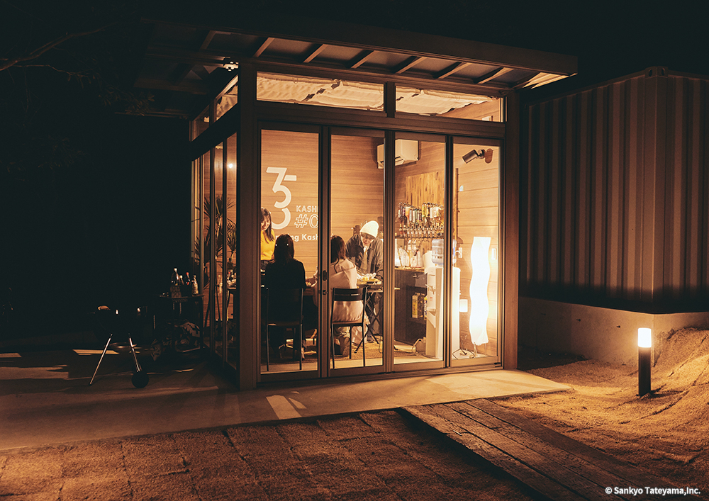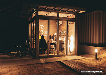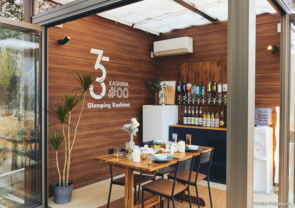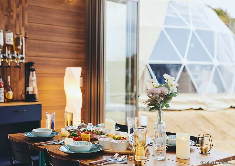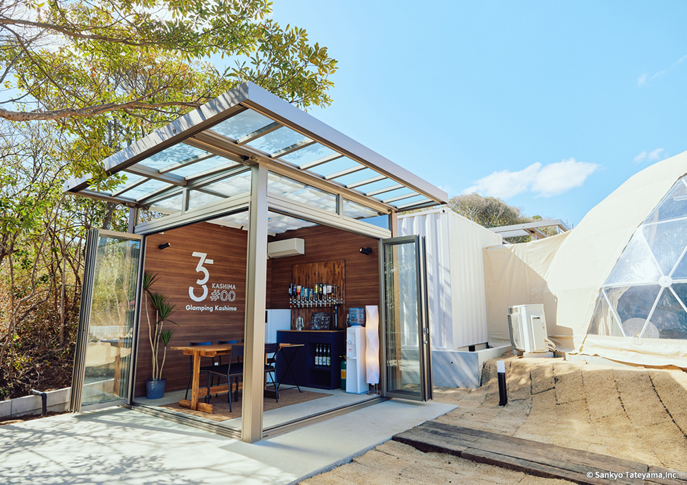 コロナ期を超えて、エクステリアでの活動が日本でも普及してきたとはいえ、夏場の猛暑、冬場の寒波を避けることのできる「プライベートシェルター」はまだまだこれから広がりを見せることだろう。グランピング施設に設置されたこの施設は、閉じていても外との一体感があり、フルオープンではテラス感のある食卓として心地よさを醸し出している。ボードのグラフィックとウッドの素材感が、アウトドア感覚を上手く演出している。