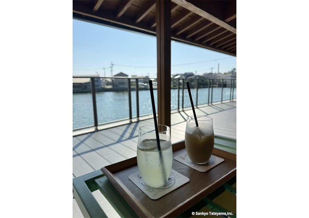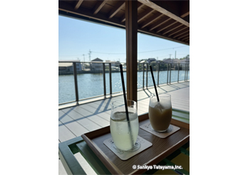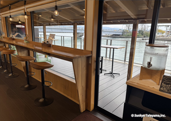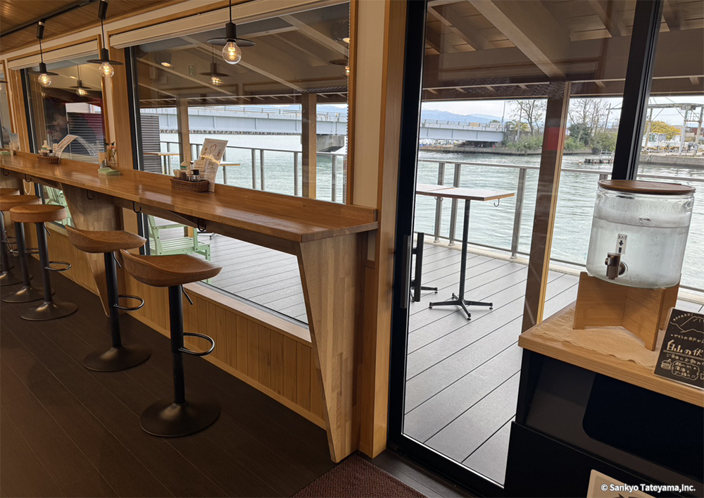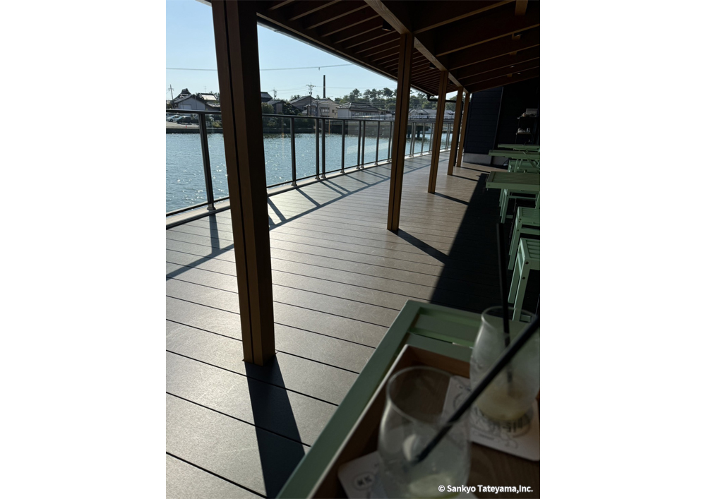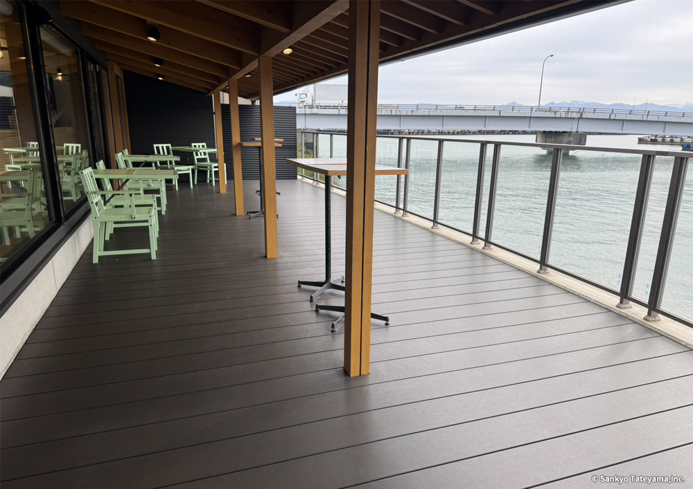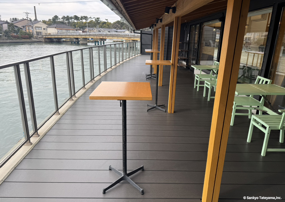 金沢市の海に近い河口に面して、歴史ある地に古い施設を活かしながら、食を伝え体験ができる施設の新たな店舗展開である。水辺の豊かな景観を活かして、目一杯その空気感と光と香りを取り入れながら、楽しむカフェ時間は、どれほど豊かに感じることだろう。しっかり出した庇で直射日光は遮蔽しながら、広く水際にひかれたヴィラウッドがその反射光を、優しく温かく室内空間に届ける役割を持つ。耐久性を持ちながらも歴史ある地域景観に限りなく馴染むデッキとなっている。