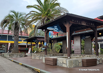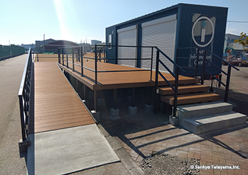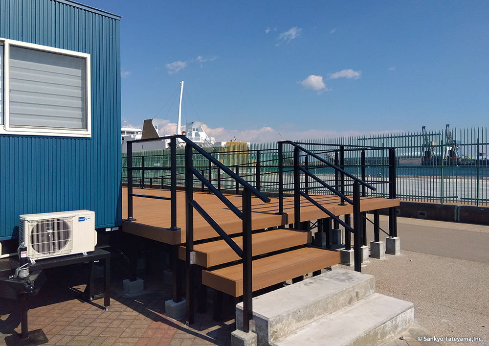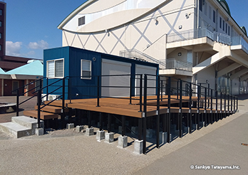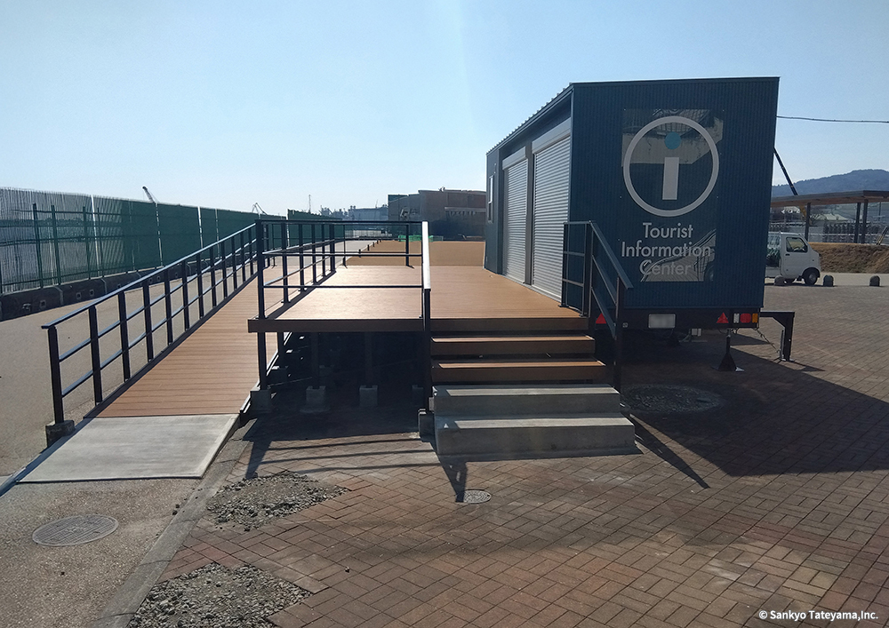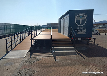 清水港で観光にも重要な日の出埠頭に登場した観光案内所である。周辺には各地の航路を結ぶマリンターミナルなどがあり、イベント空間ともなっている。清水港は「清水港・みなと色彩計画」を策定し、「アクアブルー」と「ホワイト」をシンボルカラーと位置付けている。その中でコンテナのダークブルー色は調和するとともに、デッキに活用されたヴィラウッドが、みなとらしいナチュラル感を出している。スロープと階段の両展開が、デッキの広がりを豊かなものにしている。