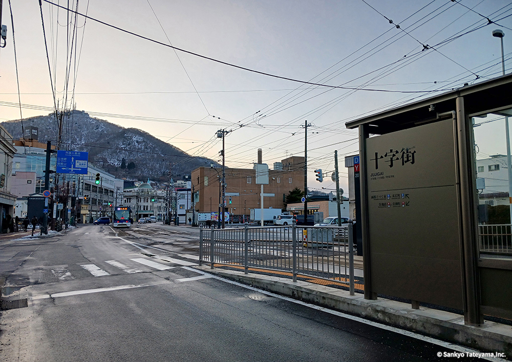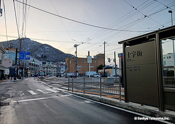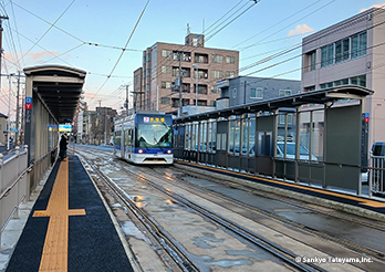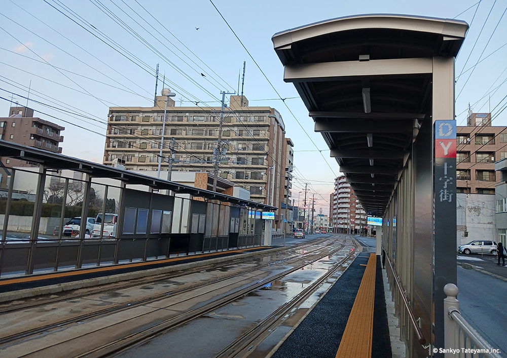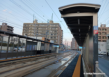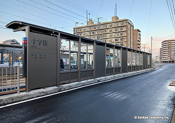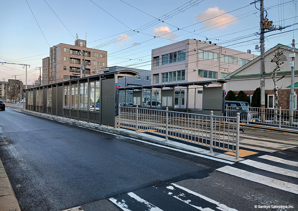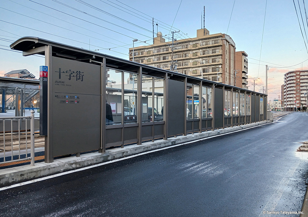 路面電車の電停は、魅力的な街中の滞在場所である。そこに暮らす人、他地域から訪れる人、その双方が交流する接点でもある。最近では車両の車体デザインもさまざまに工夫され、新旧のバラエティーも相まって、都市に現れる魅力的なスポットとなっている。その中で、脇役として人の居場所を守り、少しでも快適な待機時間を確保する重要な役割を持つのが、電停である。脇役として過度に目立つことなくアーバングレー色で、中で待つ人々の様子を伝えるとともに、中から街への視線も確保するガラス壁が上手く組み合わされている。系統表示のアクセントカラーが際立ち都市の魅力をアップしている。