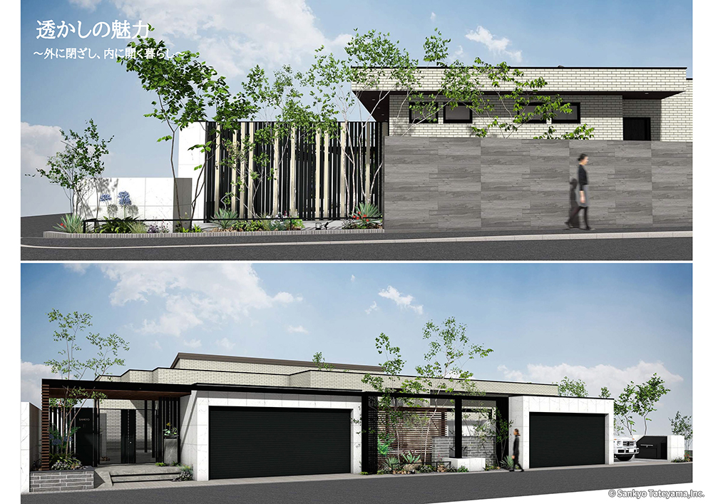 昼景と夜景ファサードの異なるクローズアップから始まり、頁を進めることで間口の広い、2つのガレージと玄関ファサードとシースルーガーデンやコーナー、中庭の水盤など全体像が次第に判明してゆく。クローズで見せないガレージと透け感のあるフレーム、格子、スクリーンと重なる植栽や灯りが通りを彩る。見えそうで見えない。クローズでありながら圧迫感はなく、奥まった中庭の居心地の良さや部屋からアウトドアリビングへとつながる解放感も感じられる。特に艶めいた夜景の表現が素晴らしい。