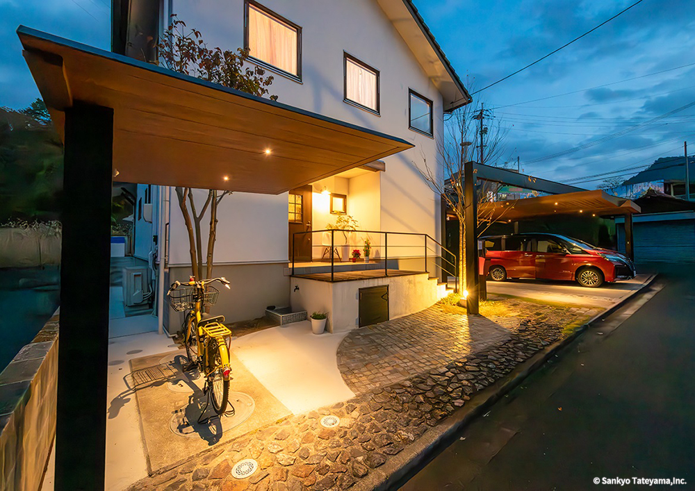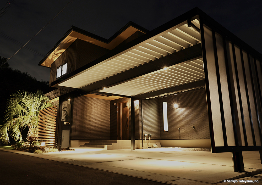 光の効果を余すところなく使われた素晴らしいご設計だと感じます。折角カーポート(屋根や梁)があるのであれば、上から照射される明るさを計画したいところ。その光をサイドスクリーンによってさらに大きく豊かに空間を効果的な存在に演出しています。折半カーポートを照明効果も絡めた憧れの姿にしていただきました。全体像として夜景観の映えをもたらす街・周辺環境にとって夜景観になくてはならない素晴らしい存在だと感じます。