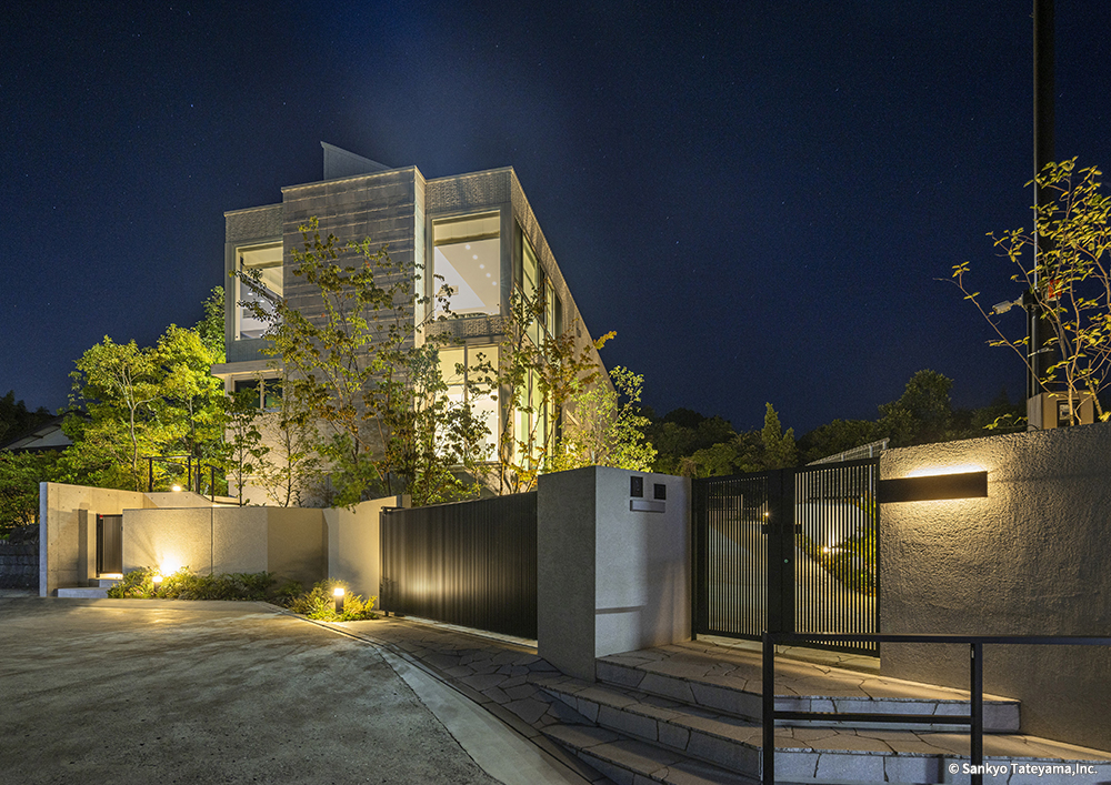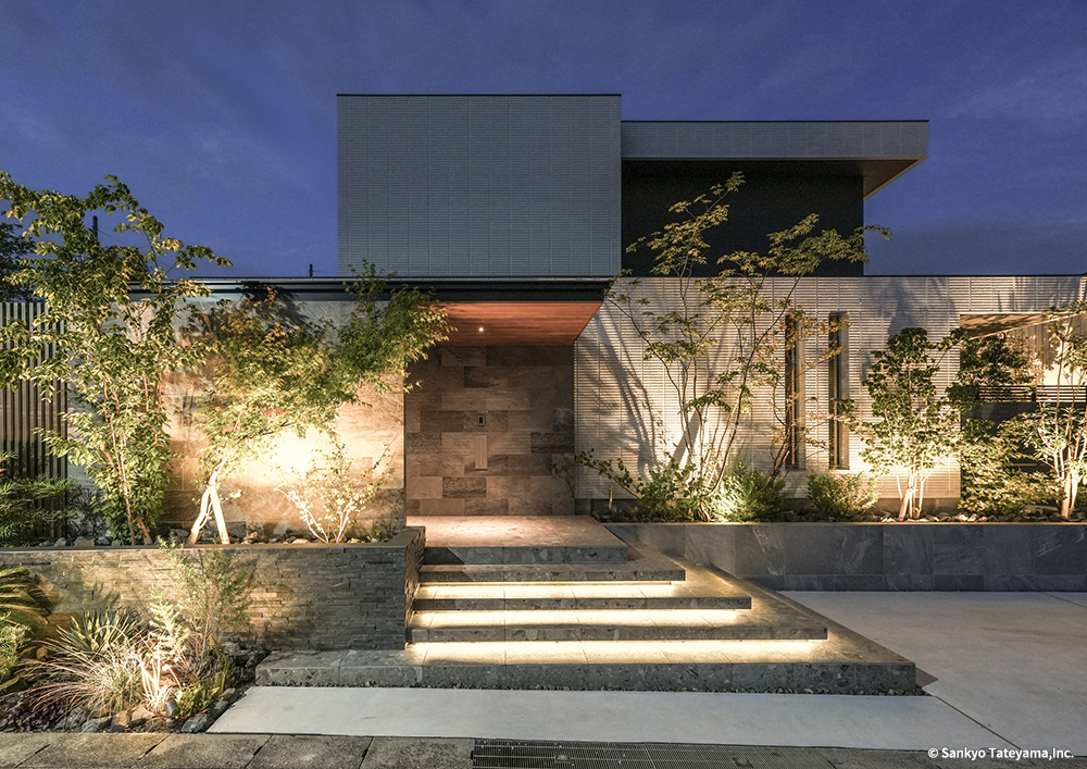 アプローチはダウンライトの明るさで存在感を際立たせ、また奥に見える樹木への明るさは導線を指し示しています。屋根部のライン照明も奥へ連なる方向性をもって誘っています。光によってメリハリあるゾーニングがなされた美しい空間だと感じます。